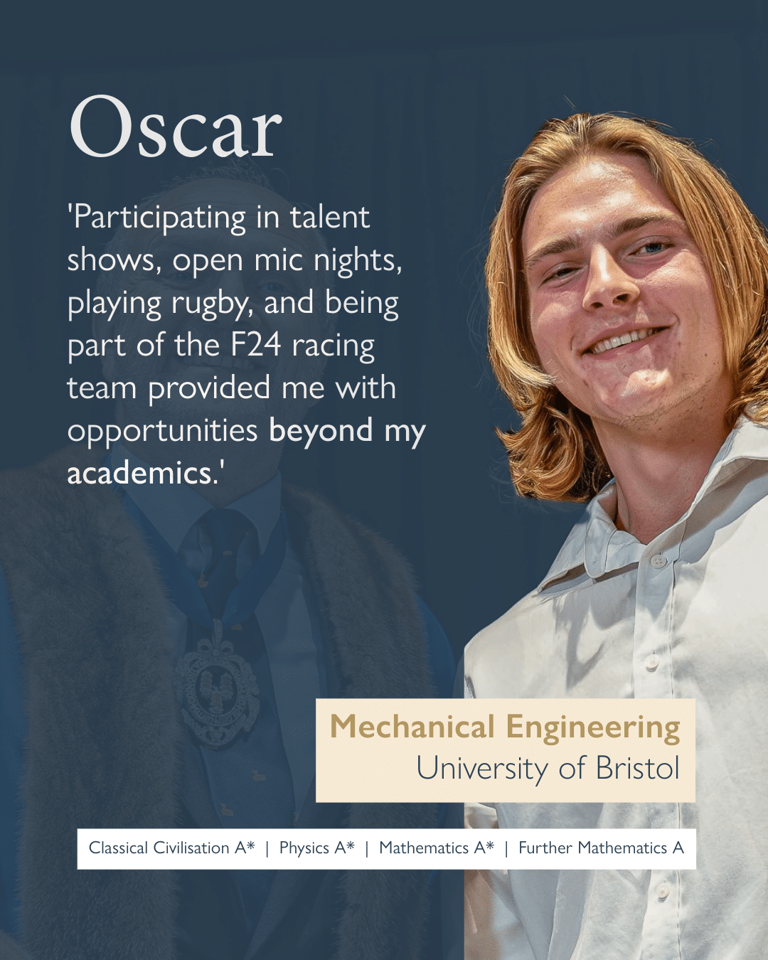 Oscar also speaks highly of the support he received during the university application process. “Mr. Harrison and Mrs. Prescott-Morrin made everything so much easier,” he says. “Their guidance was really helpful, especially during the more difficult parts of the application process.”
