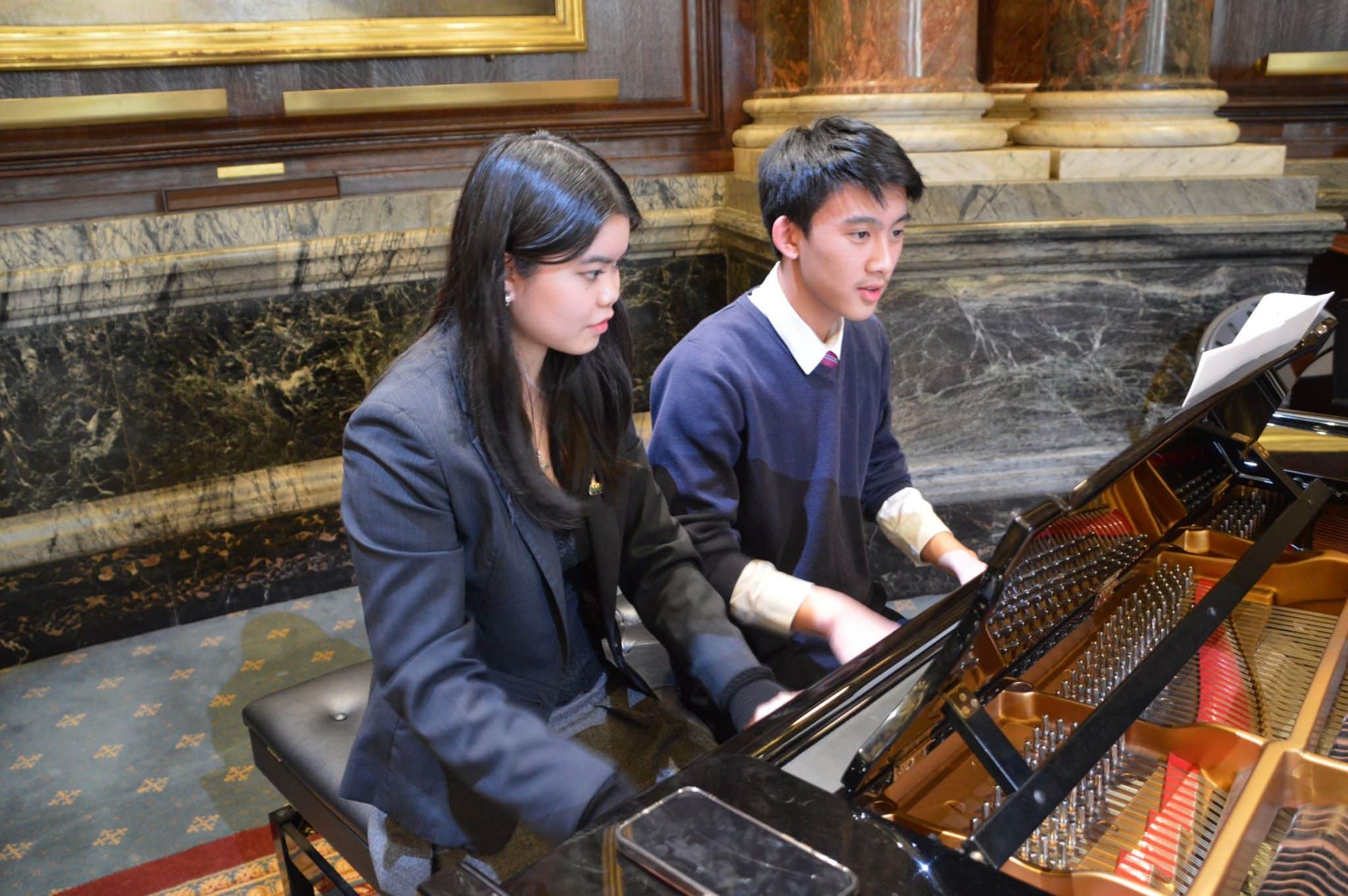 Carnival of The Animals is a suite of fourteen movements scored for two pianos and chamber ensemble, with each movement introducing a new member of the animal kingdom. The animals gather for the carnival in the work’s celebratory finale. En route to the carnival we meet, amongst others, the Lion, the Swan, the Tortoise, enjoy a trip though the Aviary and explore the world of Fossils and the Aquarium. The themes of these different beasts are explored by different instruments, so the cello (Anavi S) gave us the ethereal Swan and the clarinet (Samah B) represented the Cuckoo, whilst Nish G on the xylophone conjured up the rattling bones of the Fossils. It is a largely playful piece, which was thoroughly exploited by Jo L, Nathan T and Krishan P as the pianists, especially in the piano duets. An amusing and dramatic narration delivered with confidence and charm by Louis C and Lucas Y, led us through the menagerie.