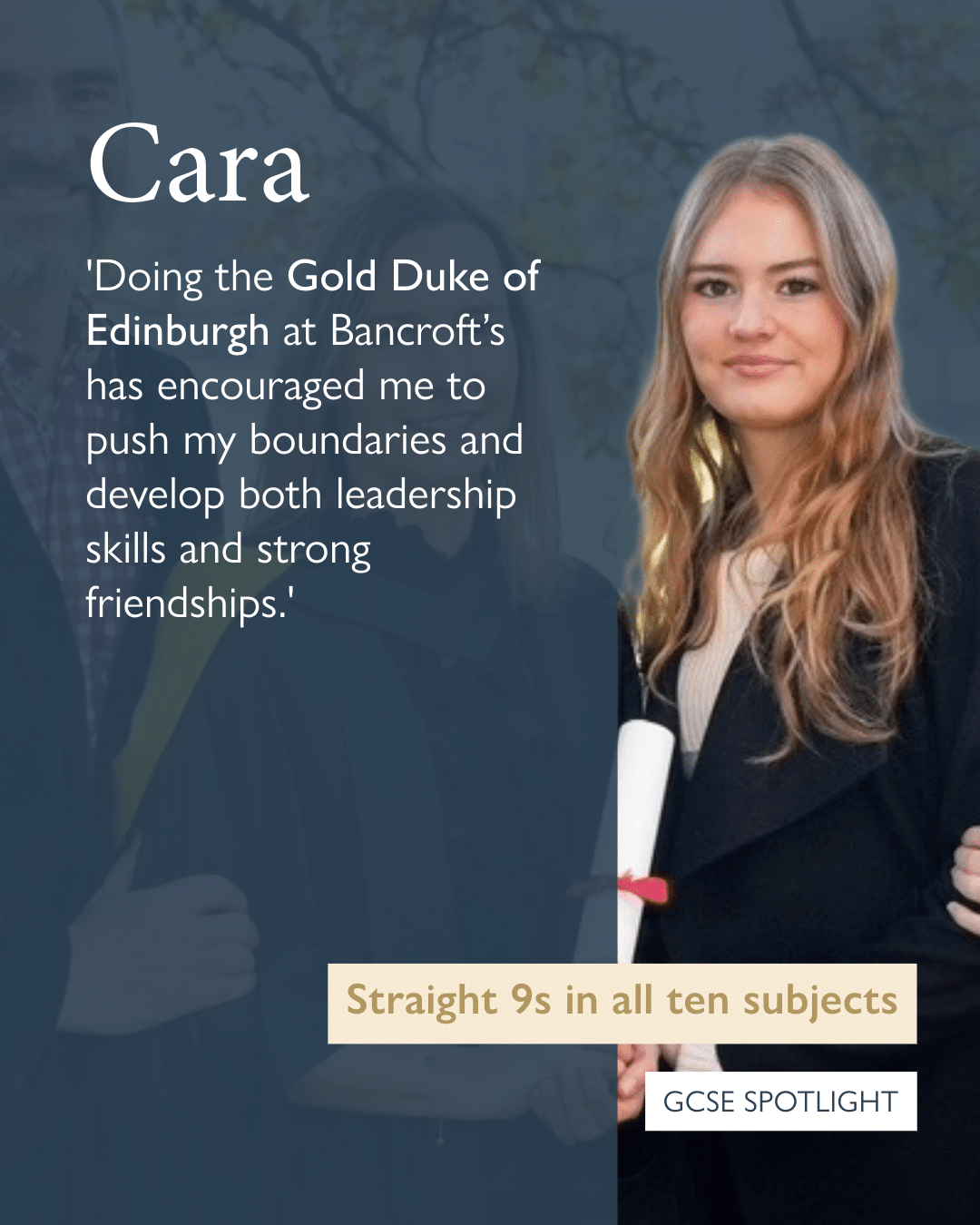 With the Gold Duke of Edinburgh Award proudly under her belt, Grade 8 Speech and Drama successfully completed, and straight 9s in 10 subjects, Cara is ready to embrace her next big adventure: the Sixth Form.![]()