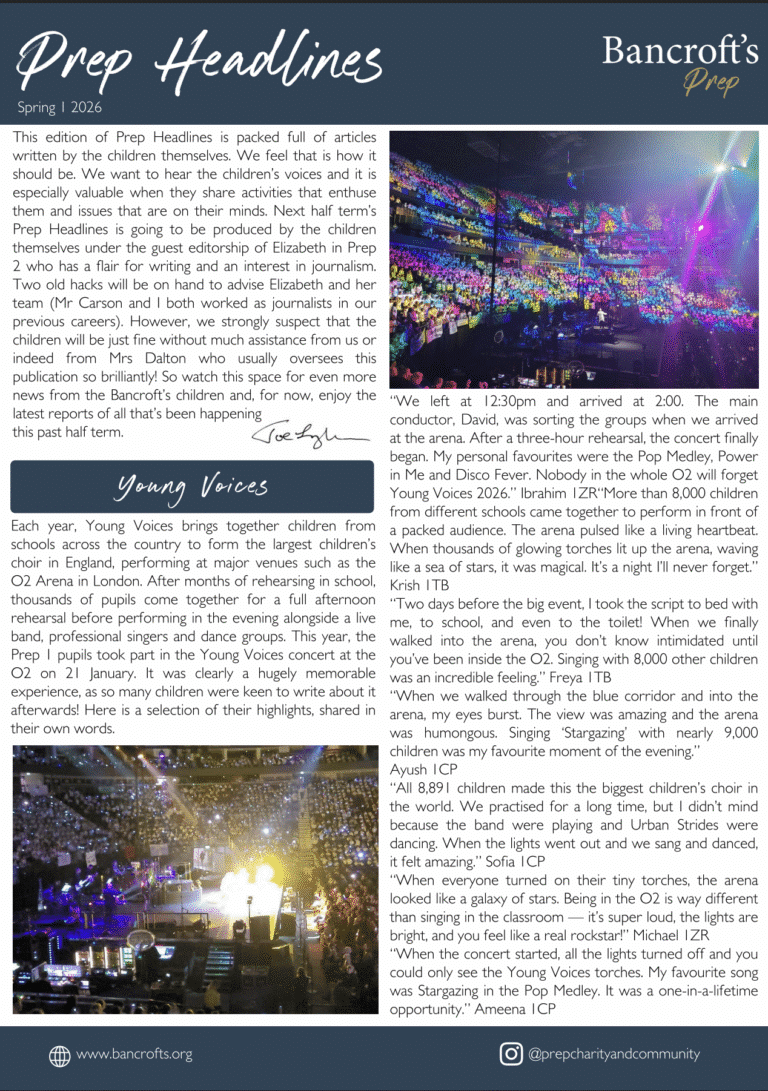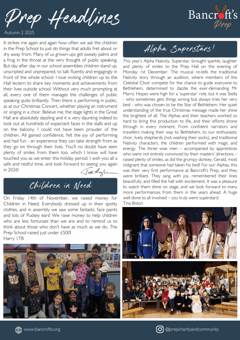 Newsletters Prep Headlines is our regular newsletter, sent to all parents keeping them updated about life at Bancroft's Prep. Prep Newsletters 13 February 2026 12 December 2025 20 October 2025 4 July 2025 23 May 2025 18 October 2024 5 July 2024 24 May 2024 28 March 2024 9 February 2024 15 December 2023 20 October 2023 6 July 2023 26 May 2023 31 March 2023 10 February 2023 16 December 2022 20 October 2022 6 July 2022 26 May 2022 30 March 2022 11 February 2022 15 December 2021 22 October 2021 7 July 2021 28 May 2021 26 March 2021 12 February 2021 15 December 2020 16 October 2020