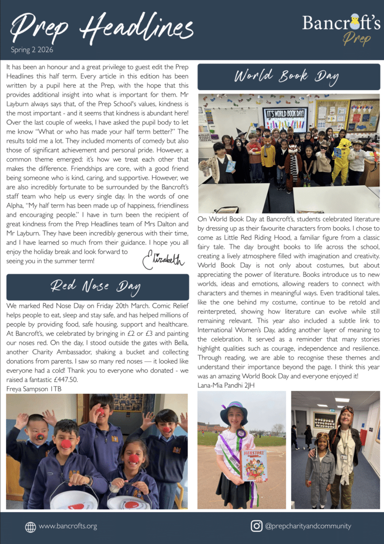 Newsletters Prep Headlines is our regular newsletter, sent to all parents keeping them updated about life at Bancroft's Prep. Prep Newsletters 27 March 2026 13 February 2026 12 December 2025 20 October 2025 4 July 2025 23 May 2025 18 October 2024 5 July 2024 24 May 2024 28 March 2024 9 February 2024 15 December 2023 20 October 2023 6 July 2023 26 May 2023 31 March 2023 10 February 2023 16 December 2022 20 October 2022 6 July 2022 26 May 2022 30 March 2022 11 February 2022 15 December 2021 22 October 2021 7 July 2021 28 May 2021 26 March 2021 12 February 2021 15 December 2020 16 October 2020